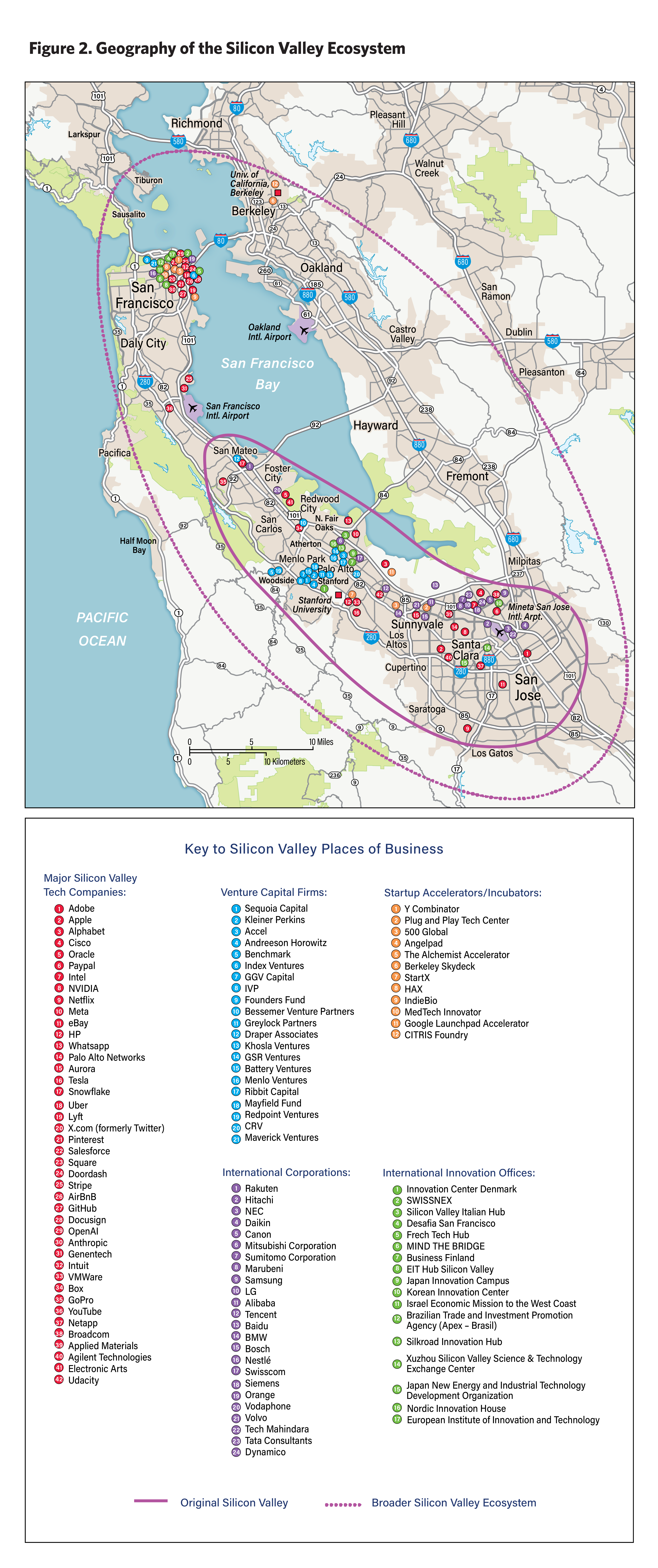 Figure 2 maps an illustrative selection of tech companies, venture capital firms, startup accelerators and incubators, international innovation hubs, and international corporation offices across the Silicon Valley region.